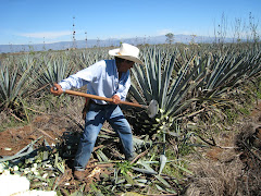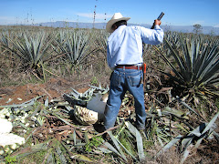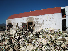 Jose Orozco picked us up at 9:30 for our Tequila Tour. Drove through Guadalajara and Zapapan on our way to the town of Tequila. As we approached, the landscape changed. It was open space with fields and fields of blue agave plants. In the distance there were steep mountains. This is the dry season, so much of the landscape is brown. The blue-green agaves stand out. Our first stop was at "Tres Mujeres" a small family run distillery. We walked into the fields to watch a worker chop the leaves off the agave plant until he had the heart of the agave which they call a pina (pineapple). This pina can weigh as much as 160 pounds. Being too heavy for the men to safely move, they cut the pina in half. We were invited to taste the inner white part of the pina. It was similar in taste and texture to jicama.