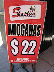 Past lunch time. Ann and I proceeded down the block to Shapliin's, a small, clean restaurant on the corner of Cinco de Mayo and 16th of Septiembre. They sell one of the popular dishes of the area "Ahogadas". I warned Ann in advance that this was a "messy" meal. She soon saw for herself.