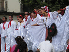We had planned to walk the route towards Guadalajara but, only went two blocks when we noticed a stage at the SW corner of the Parian. There were men and women in traditional dress whom I recognized as Ballet Folklorical. We took our seats on a shaded park bench opposite the stage. We did not wait long for the two hour show to begin. We were joined by Santiago a man in his 40's in a wheelchair and his mother Ramona. Santiago had lived in California, so he spoke some English and was able to help us interpret the dances. In addition to the traditional dances, they performed several interpretive dances. Those performers had a ballet background as they danced with poise and fluid movements. Performance started with the Danza de Los Viejos (Dance of the Old Men) one of my favorite Mexican dances.